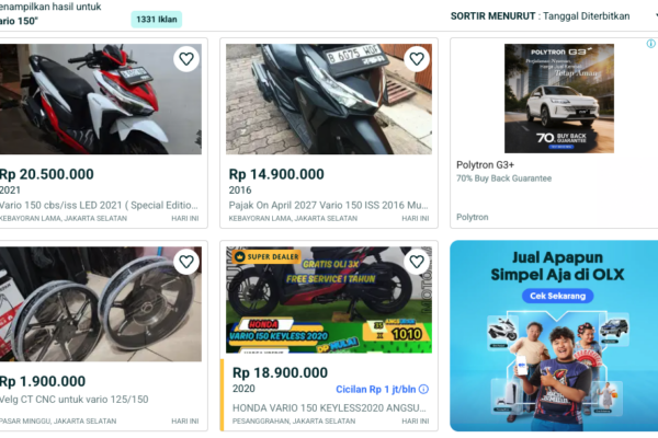 Di era digital seperti sekarang, membeli dan menjual motor bekas maupun baru menjadi semakin mudah berkat platform jual beli online seperti OLXMobbi. Salah satu motor yang paling banyak dicari di pasaran adalah Honda Vario 150. Skutik matic ini terkenal karena efisiensi bahan bakar, desain modern, ... cara aman bertransaksi Vario 150 di platform OLXMobbi. Keunggulan Honda Vario 150 yang Membuatnya Banyak Dicari Honda Vario 150 pertama kali diluncurkan sebagai penerus Vario 125 dan langsung mendapat sambutan positif dari masyarakat Indonesia. Motor ini dibekali mesin 150cc dengan teknologi eSP